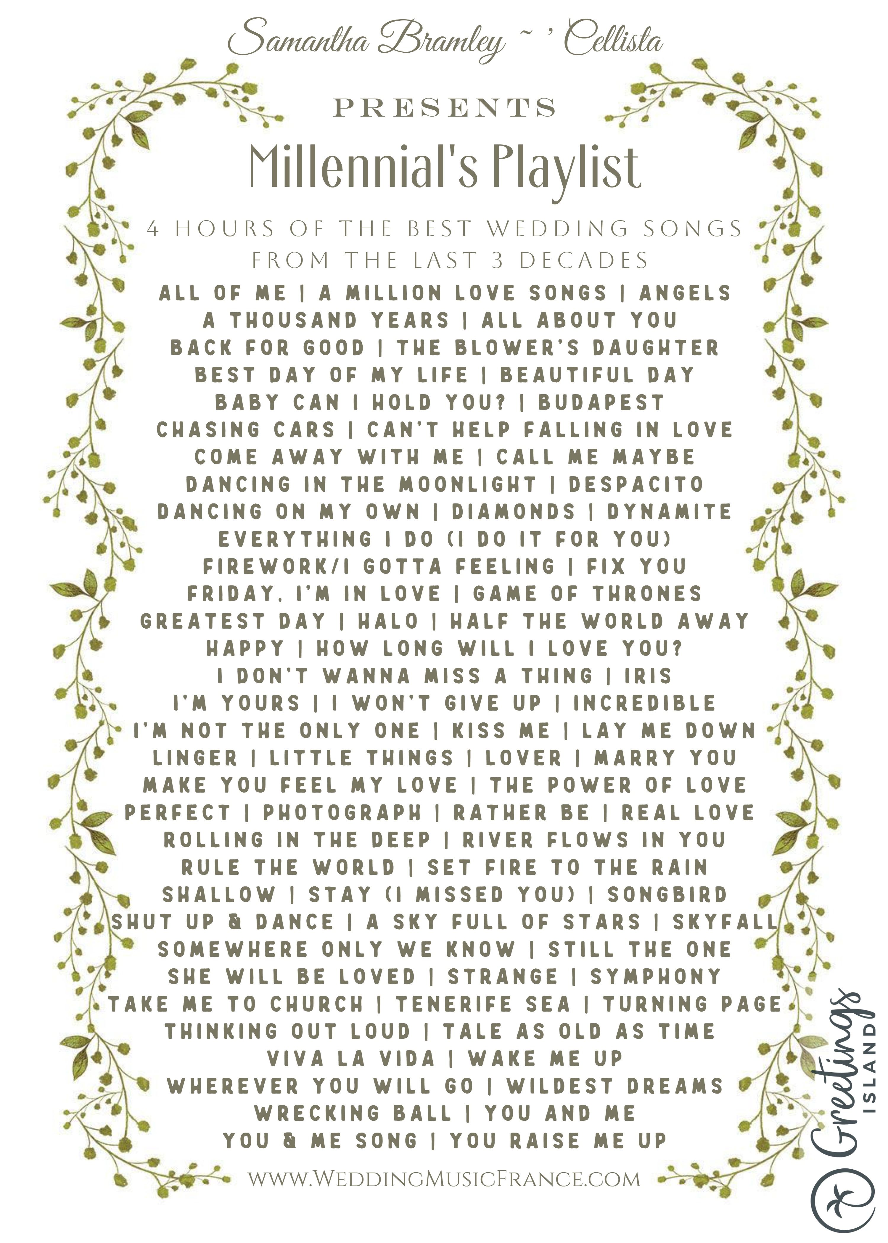 Millennials Playlist… Perfect for nineties/noughties couples, here you will find 4 hours of the best wedding songs from the last 3 decades.